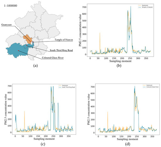 Spatial Correlation between different areas in Beijing. (a) the geographic location of four different areas in Beijing. The scale is 1:1,000,000. (b) PM2.5 changes in Guanyuan, Haidian, and Temple of Heaven, Dongcheng. (c) PM2.5 changes in Guanyuan, Haidian, and South Third Ring Road, Fengtai. (d) PM2.5 changes in Beijing Guanyuan and Coloured Glaze River, Fangshan.