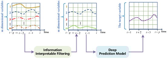 This paper will design a deep forecasting network based on information interpretability filtering. As the first layer of the network, the information interpretability filtering layer selects the m-dimensional variable with high correlation and low redundancy from the n-dimensional time series data. Then, these variables are input to train the deep forecasting model. The flow of this model is shown in Figure 2. We will detail the information interpretability filtering in Section 4 and the deep forecasting model in Section 5.