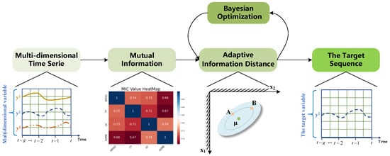 Information interpretability filtering consists of mutual information, AID, and Bayesian hyperparameter optimization. Among these, the mutual information methods selects variables with a high correlation with the target variable. AID sets variables with lower redundancy so that the variables with high correlation and low redundancy will be filtered out. Bayesian hyperparameter optimization learns the parameters required by AID according to the different input data in order to obtain correct input data, thereby improving the forecasting accuracy of the target variable. The computational flow chart of the interpretability filtering of information is shown in Figure 3.