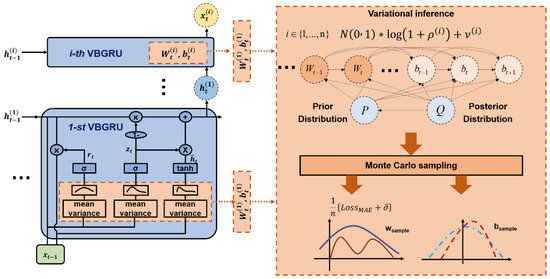 As shown in Figure 4, the weights and biases of VBGRU are transformed into distribution via the variational inference method. The specific process is: first, initialize the weight and bias of the VBGRU to the distribution of a specific mean and a specific variance. Then, the new weight and bias are sampled from the corresponding mean and variance through the Monte Carlo sampling module. The weight calculation method not only optimizes the performance indicators of the model but also learns the uncertainty of the network forecasting on a specific data point. In addition, VBGRU can obtain multiple model outputs by adding sampling points to calculate the uncertainty of the model at a specific point.