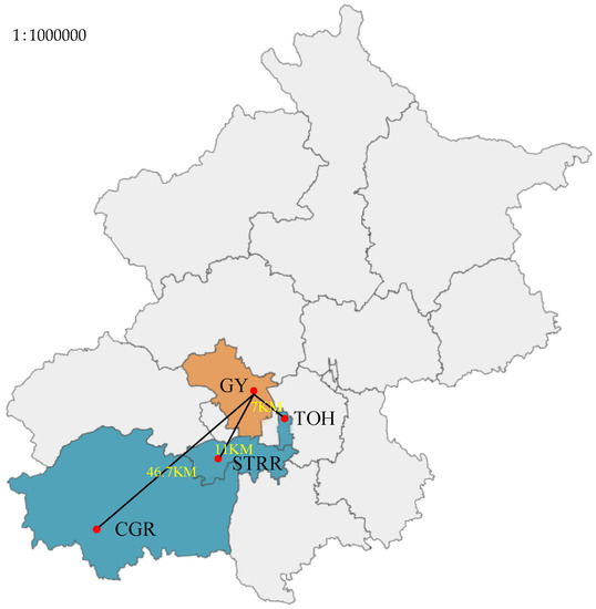In this part, we analyze the correlation between PM2.5 in the Guanyuan (GY) area of Haidian District with PM2.5 in other different regions [39], including Temple of Heaven (TOH) in Dongcheng District, South Third Ring Road (STRR) in Fengtai District and Coloured Glaze River (CGR) in Fangshan District. Figure 5 shows a schematic diagram of the positions between different regions. The MI value and AID value between PM2.5 in different regions and PM2.5 in the GY region are shown in Table 1.