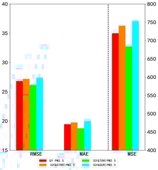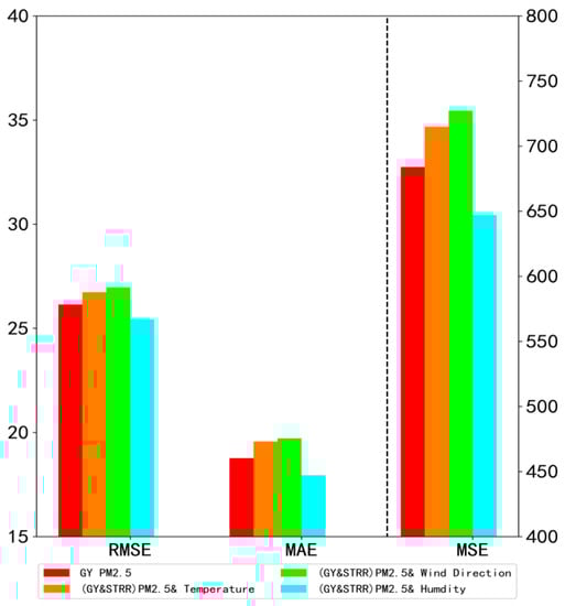 To verify our conclusion, the optimal results obtained in Table 4 are combined with each meteorological factor to forecast the future of PM2.5. The forecasting results are shown in Figure 7 and Table 4. Figure 7 shows the comparison results of the three evaluation indicators of (GY & STRR) PM2.5, combined with meteorological factors in different regions. It is clear from the figure that the RMSE, MSE, and MAE of the combined humidity have the slightest error from the actual values. From the results listed in Table 5, it can be seen that the forecasting errors obtained by adding two factors, temperature and wind direction, as auxiliary variables have improved to varying degrees; only the forecasting error of adding the humidity factor as an auxiliary variable has a significant decrease, and the RMSE has decreased from 26.15 to 25.44, a reduction of 2.7%; MSE decreased from 684.02 to 647.17, a decrease of 5.4%; MAE decreased from 18.77 to 17.95, a decrease of 4.4%. Besides, since the forecasting model in this experiment is the same, the training time using different regions as the input data of the network is all around 46 s, and there is no significant difference in the fluctuation of results.