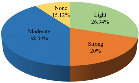 In this paper, 410 sets of valid rockburst data were selected to carry out the study of rockburst risk prediction, and all data were obtained from published materials and papers on relevant domestic and international projects [27,41,43,50,51,52,53,54,55,56,57,58,59,60,61,62,63,64,65,66,67,68,69,70,71,72,73,74,75,76,77,78,79,80,81,82,83,84,85,86,87,88,89,90,91]. The database classifies the rockburst risk into four classes, i.e., none, light, moderate, and strong. According to the distribution of the data samples, the distribution of rockburst classes can be plotted as shown in Figure 1. As can be seen in Figure 1, none rockburst events totaled 62, accounting for about 15.12%. Light rockburst events totaled 108, accounting for about 26.34%. Moderate rockburst events totaled 158, accounting for about 38.54%. Strong rockburst events totaled 82, accounting for about 38.54%. For the convenience of statistical analysis and calculation, the above-mentioned rockburst level samples were marked as 0, 1, 2, and 3. From the sample database of case statistics, it can be found that the largest amount of data was on moderate rockburst, and the minimum number of samples was for none rockburst events, which indicates that the sample exhibited an overall inhomogeneity. For the choice of data set, the larger the sample data volume, the less the fitting phenomenon, the better the model computation, and the better the computation model when processing test set data.