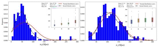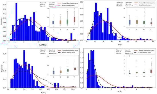 In this paper, six characteristic indicators of maximum tangential stress (σθ), uniaxial compressive strength of rock (σc), uniaxial tensile strength of rock (σt), elastic energy index of rock (Wet), stress coefficient (σθ/σc), and rock brittleness coefficient (σc/σt) were selected to carry out the research work of rockburst risk prediction. The sample distribution and box plots of each characteristic index corresponding to different rockburst risk levels are shown in Figure 2. Table 1 describes the characteristics of statistical parameters of indicators for rockburst. Average means average of the sample. S.D. (standard deviation) of the sample is the arithmetic square root of the arithmetic mean from the square of the mean difference. Min. and Max. represent the maximum and minimum values in the sample, respectively. Finally, 25% quantile, 50% quantile, and 75% quantile represent the figures of 25%, 50%, and 75% of all values in the sample, arranged from small to large, respectively. From Figure 2 and Table 1, the overall sample distribution showed a normal distribution form, but for different characteristics of the indicators, there were outliers, especially σθ/σc and Wet. In addition, the outliers of some indicators may be higher than the high-level risk distribution values of the same indicators. Moreover, the distribution of the characteristic indicators corresponding to different rockburst risk levels can be seen in the box plots, where the upper and lower edges, upper and lower quartiles, and sample medians of some of the characteristics did not differ much (e.g., σc and σt), and there was an overlap in the range of scalar values of the high-grade rockburst samples.