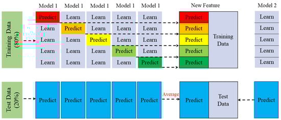 First, the rockburst data were decomposed into a training set and test set, and the samples of the training set were further partitioned by using the five-fold cross, in which four copies were used to train the base classifier, and one copy of the training set samples was applied as input to the trained model together with the test set. We circulated the abovementioned steps five times, resulting in five forecasts. Further, the five prediction results were reassembled in the original order and input to the new classifier as new data features, while the five prediction results of the test set were averaged and used as the test set of the new classifier, thus ensuring that the number of prediction samples and data features of the meta model were consistent with the dimensionality of the base classifier.