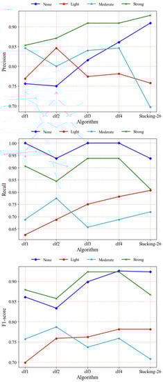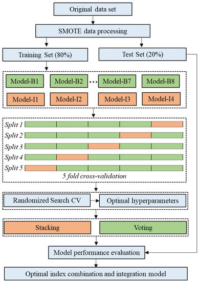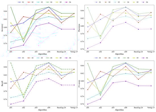 - The optimized base models were selected as an appropriate integration strategy for algorithmic fusion. In this paper, the stacking integration strategy and voting integration strategy were chosen as the integration rules. Stacking integration was referred to the basic algorithms—basic algorithms, basic algorithms—integration algorithms, integration algorithms—basic algorithms, integration algorithms—basic algorithms, which are composed of base models and meta models. The voting method proposed three integration strategies, including eight basic algorithm models weighted integration, eight integrated algorithm models weighted integration, and basic algorithm models + integrated algorithm models weighted integration, and selected accuracy, F1 score, recall, precision, and cv-mean as the weight values.