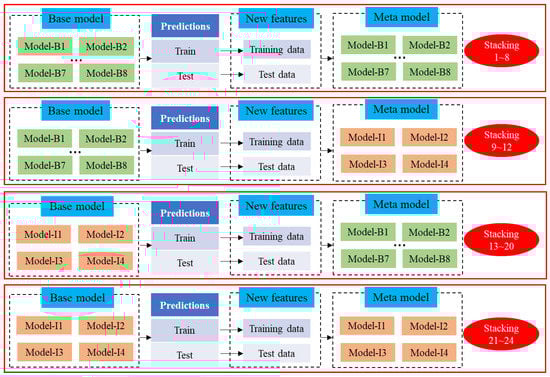 - Calculate the accuracy and evaluation indexes of 24 stacking integration algorithms (Stacking1~Stacking24) to determine the best stacking integration strategy and model. The strategy and process of stacking integration algorithm are shown in Figure 6.