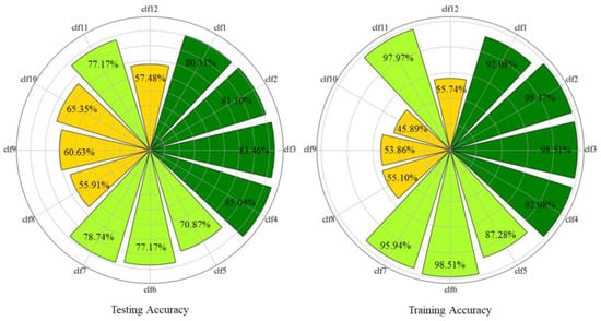 In this part, 12 base models were evaluated using the test set. Table 3 lists the accuracy, precision, recall, F1 score, and cross-validation results for each algorithm, where clf1 to clf4 denote the integrated algorithms including Random Forest, LightGBM, XGBoost, and CatBoost, respectively. clf5 to clf12 denote the base algorithms including decision tree (DT), K-neighborhood algorithm (KNN), support vector machine (SVM), logistic regression (LR), linear discriminant analysis (LDA), multilayer neural network (MLPCC), Gaussian process (GP), and Bayesian model (NB). It can be seen from Table 3 that CatBoost had the best results in terms of accuracy and other evaluation metrics, including a training accuracy of 85.04%, precision of 84.93%, recall of 85.04%, F1 index of 84.65%, and cv_mean of 78.02% (in agreement with XGBoost). The training accuracy of the logistic regression (LR) algorithm was the lowest with 55.91%, and the other evaluation indexes (except cv_mean) performed the worst with 56.71%, 55.91%, and 56.08%, respectively. The Cv_mean index of the multilayer neural network (MLPCC) was the lowest with 43.35%. Considering the accuracy and other evaluation metrics of each algorithm, the ranking order of the base algorithms could be obtained as clf4 > clf3 > clf2 > clf1 > clf7 > clf6 > clf11 > clf5 > clf10 > clf9 > clf12 > clf8. This also indicates that the integrated algorithm performed better compared with the basic algorithms. The “accuracy” in Table 3 refers to the accuracy on the training set, corresponding to the left-hand picture in Figure 7. The “testing accuracy” in the picture to the right in Figure 7 refers to the accuracy on the training set. A comparison of the two values shows whether there has been fitting in the sample for the classification method.