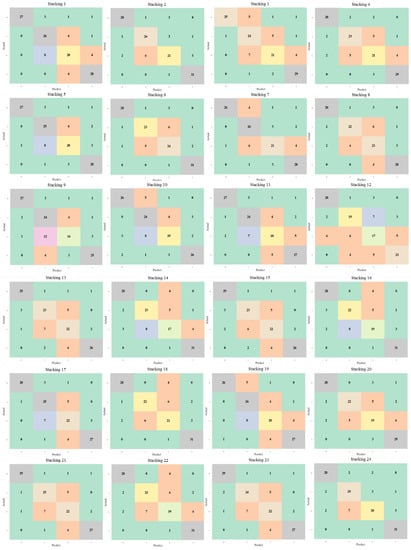 Twenty-four integrated model algorithms (Stacking1~Stacking24) were obtained by the stacking integration strategy, and their confusion matrix is shown in Figure 8. In this section, the base algorithms in the integration algorithm meta models were compared and analyzed with the base algorithm models that were not fused. Here, the stacking fusion model with the base classifier as the integrated algorithms are all called Stacking-I, and the stacking fusion model with the base classifier as basic algorithms are all called Stacking-II. The evaluation index of each algorithm in each level of rockburst level prediction is shown in Table 4, Table 5, Table 6 and Table 7. The average of the improvement rate of each evaluation index in each level for each meta model in each group of stacking integration algorithms is shown in Figure 8.