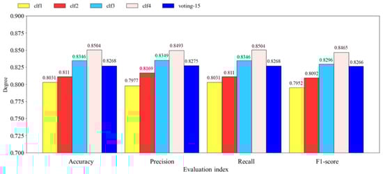 From the abovementioned equation, it is clear that the focus of the weighting strategy is to determine the size of the weight values. Usually, the classification performance of the base classifier can be determined by its accuracy, F1 value, precision and recall [94]; therefore, in determining the weight value of the weighting fusion algorithm, this paper selected the abovementioned classifier performance evaluation index to determine its weight value. In addition, this paper also selected the cv (cross-validation) [95] results of each base classifier itself as the weight values. The abovementioned weighting indexes were calculated as follows.