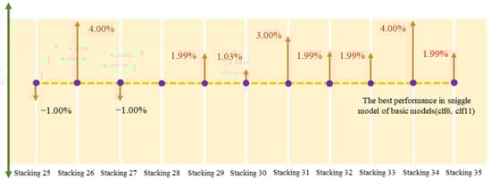 From the abovementioned formulation, it is clear that the base models and meta models are the core of the stacking integration algorithm, the essence of which is that the prediction results output from the base model are the input features of the meta model. Usually, the base models may contain one or more strong classifiers, which require high complexity and high learning ability, while the meta models contain only one classifier, which usually has high interpretability and a simple structure. It may result in different algorithms behaving differently in terms of feature information when processing sample data, and thus, if the models are not properly fused, the prediction accuracy of a single basic classifier may be higher than the output of the meta models.