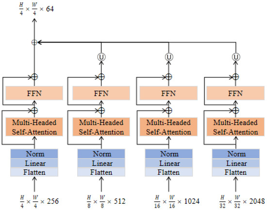 After multi-head self-attention layer weighting and FFN transformation to a specified number of channels, we have 64 channels. The feature map obtained from each layer is upsampled to the size of the first layer using a bilinear interpolation method. The feature maps of all layers are fused, and the operation process can be expressed as follows: