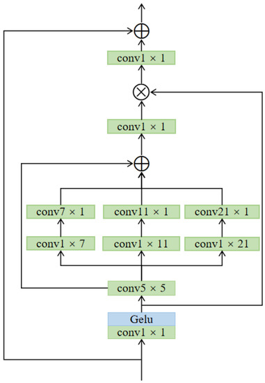 This convolutional attention module contains several main parts. One is the cross-channel linear combination of input feature information that uses 1 × 1 convolution, that is, linear transformation along different channels, to integrate the information between different channels. Second, for multiscale contextual feature integration, we choose to use a 5 × 5 convolution to guarantee an effective receptive field [41]. Although using two 3 × 3 convolutional stacks reduces the number of parameters, the proper use of large convolutional kernels can strengthen localization and classification ability [42]. Subsequently, convolutional attention is divided into (1 × 7, 7 × 1), (1 × 11, 11 × 1), and (1 × 21, 21 × 1) convolutional sizes. Dividing a two-dimensional convolution into a series of asymmetric convolutions can effectively reduce the total number of parameters to a great extent, while the banded convolution facilitates the analysis of narrowly shaped targets [43], which also ensures accuracy. Therefore, we use three asymmetric convolutional kernels of different sizes instead of multiheaded self-attention, and the process of multiscale attentional analysis from can be expressed as: