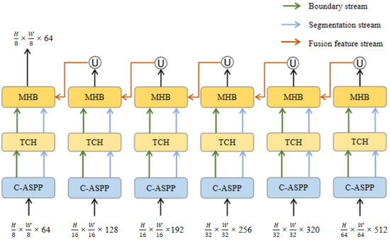 The CCFF module, whose structure is shown in Figure 5, contains six groups of feature fusion modules composed of three parts: C-ASPP, transformer conversion head (TCH), and mixing head block (MHB). The purpose of the C-ASPP is to transform the input feature information cross-modally into boundary and segmentation features. TCH reuses self-attention weighting for the obtained boundary and segmentation features. MHB fuses the features of the previous layer and reuses the self-attention weighting for the fusion results. The input of each group comes from the output of MFT, and its top-to-bottom input shapes are (, , 64), (, , 128), (, , 192), (, , 256), (, , 320), and (, , 512).