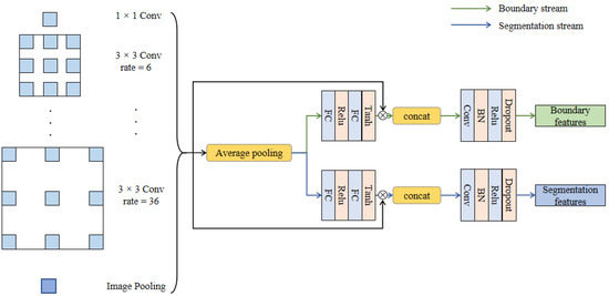 To avoid losing accuracy by downsampling and to generate redundant computations by repeatedly convolving the same region, we invoke a dilation convolution method called ASPP [31]. Our C-ASPP also benefits from the structure of the cross-modal analysis boundary and segmentation features in AdaptiveASPP [19], which uses dilation convolution with five dilation rates. Owing to the multilevel structure of our MFT, we further extend ASPP [31] to ensure that each receptive field can obtain sufficient features. The C-ASPP structure shown in Figure 6 was also designed with a dilation convolution structure having six dilation rates of 6, 12, 18, 24, 30, and 36 steps. Dilation rates can serve to increase the receptive field without downsampling to analyze a larger range of feature information. First, features are input to C-ASPP to obtain boundary and segmentation features across modalities to obtain more information about the scaled receptive field. We use the ASPP [31] to obtain multiscale features with different dilation rates and to preserve the overall data features and prevent overfitting using adaptive, two-dimensional averaging pooling: