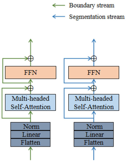 The C-ASPP module processes the features of each MFT layer and outputs the boundary and segmentation features cross-modally. During feature fusion, redundant information is generated owing to differences in the features of different cascades [39,40]. Therefore, they are input into the two lightweight TCHs, as shown in Figure 7; then, attention weights are added to them, and the redundant information is filtered. The green branch represents the boundary flow, and the blue branch represents the segmentation flow. The same attention-weighting formula as in Equations (1)–(4) is used and applied to the boundary and segmentation features, respectively.