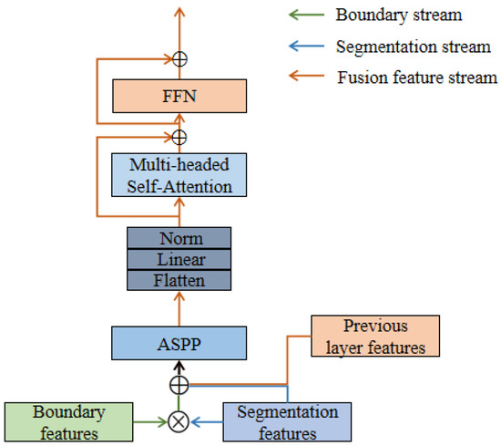 To realize the contextual linkage of multilevel receptive fields, it is necessary to fuse the boundary features with the segmentation features and the features of the previous layer at each layer. Because the features in the previous layer need to be upsampled for fusion, some features are lost during the upsampling process. To ensure accuracy, it is necessary to perform feature analysis again after fusion; therefore, we designed MHB. As shown in Figure 8, it contains a lightweight ASPP layer and a lightweight transformer header. The segmented features are first fused and enhanced with boundary features, and then passed to ASPP along with the features of the previous layer to achieve context-dependent feature fusion of multilevel receptive fields, which is represented as: