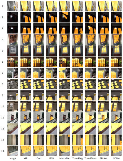 In Table 1, we show the evaluation results of our method on the GDD dataset compared against other studies, with specific evaluation results from the aforementioned previous study [20]. As can be seen from the comparison in the table, our method has a much higher IoU score than do the other methods. The IoU metric is the most important performance metric in the field of semantic segmentation, and the IoU of our method is 0.66% higher than that of the current state-of-the-art glass segmentation method PGSNet, and the of our method is 0.7% higher than PGSNet. As shown in Figure 9, a qualitative comparison was made with six state-of-the-art glass and transparent object segmentation methods (salient object detection method ITSD [60], transparent object segmentation methods Trans2Seg [16] and Trans4Trans [58], mirror segmentation method MirrorNet [17], glass segmentation method EBLNet [26], and GDNet [15]). Our TGSNet can segment glass regions in dark light (rows 2 and 3), in multiple glass regions (rows 4, 5, 6, 8, 9, and 10), and in large glass region (rows 1, 7, and 13), as well as outdoor natural lighting conditions (rows 4, 5, 11, and 14), and the rest are lighting conditions for different types of lights indoors with almost no false detection with almost no false detection and with smoother edges than the other methods while ensuring the integrity of the segmented glass regions. This is mainly because the multiple-use lightweight transformer header in TGSNet can filter redundant information and explore different background levels to enhance the features. For example, on the right side of the resulting image in row 6, other methods would label part of the nontarget region as glass, while our method filters the redundant information contained in the features multiple times due to its different receptive fields. Filtering is carried out both to locate the glass region more accurately while limiting the impact of the background (rows 1 and 7) and to retain more detail (rows 12 and 14).
