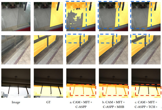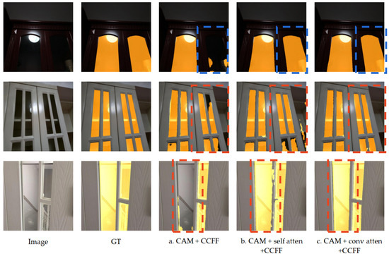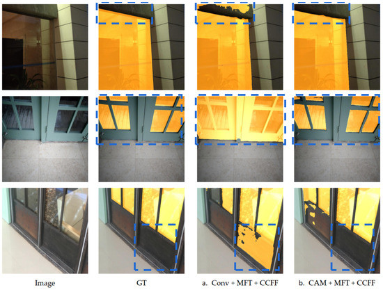 In addition, as shown in Figure 12, we qualitatively show that a more complete detection of the glass region is possible with the introduction of the multi-head attention mechanism and the multiscale convolutional attention mechanism (as shown in the blue dashed box in row 1) and can segment the target and nontarget regions more precisely, preserving greater detail (red-dashed boxes in b and c).