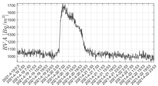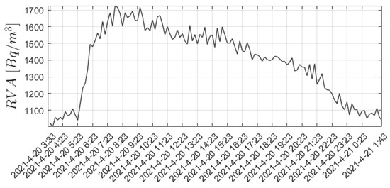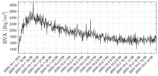 The sharp rise in RVA is probably associated with deformations that cause changes in the flow of radon through the area under the accumulation chamber. In this case, the impact of a voltage pulse can be of different intensity and duration. As shown above, there are quite a lot of models describing radon migration in rocks. Based on them, it can be assumed that against the background of a constant flow of radon entering the chamber where the sensor is located, an excess volume of radon may occur, associated with a different reaction of the medium to deformation processes (according to the models from the works listed earlier). This excess radon, depending on the depth or volume of the environment in which it was released, enters the groundwater flow or new cracks that form and rushes to the surface of the Earth due to movement in the water flow, diffusion, and convection. This process determines the ascending part of the anomalous RVA curve relative to the background values. Since radon continuously decays after its formation, the maximum of the anomalous RVA curve is determined by the volume of released radon and the time of arrival from the depth where it began its migration.