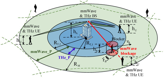where is the probability that a session is associated initially with the THz part. Note that for the THz preferred and for the mmWave preferred strategy. Using the introduced antenna and propagation models, can be found assuming the nLoS state [25,26]