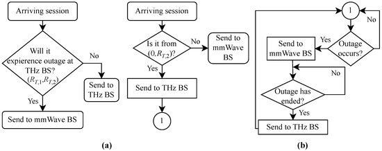 Illustration of the considered association schemes. (a) mmWave preferred, (b) THz preferred.