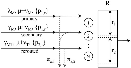The service intensity of primary and secondary sessions is , while the service intensity of the rerouted sessions is . Since the resource requirements of primary and secondary sessions are equal, they can be aggregated in a single arrival flow with the offered traffic load
