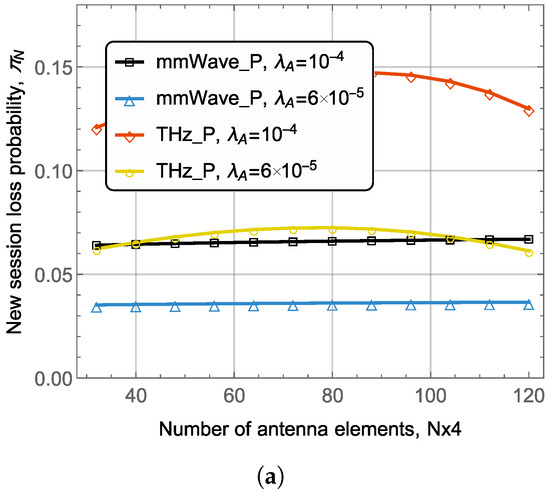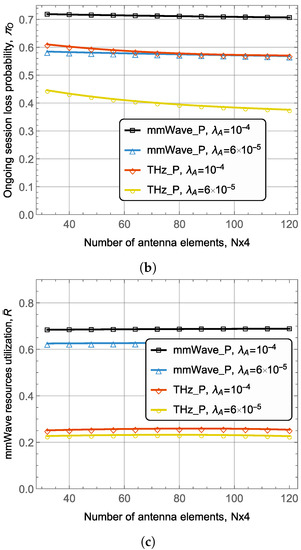 We start with Figure 4 illustrating the considered metrics for two session arrival rates and different association strategies. First of all, considering new and ongoing session loss probabilities in Figure 4, observe that the increase in the array size does not affect the new and ongoing session loss probabilities for the mmWave preferred strategy. The rationale is that the THz BS coverage radius, where blockage does not induce outage increases insignificantly, from 15 m to 25 m, see (19). From this point of view, this scheme does not offer any flexibility for dual-band UEs.