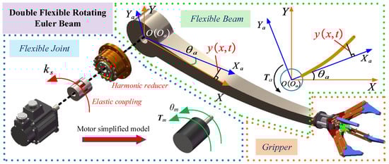 In terms of dynamic modeling of double flexible body, the literature [9,10] proposed that the flexible joint that transmits power between the motor and the load is equivalent to a small damping spring, and the double inertia system is used to represent the flexibility of the joint. In the literature [11], flexibility and friction factors were considered, and the dynamics of a flexible manipulator with a terminal load was established by using the assumed mode method and Lagrange principle. In the literature [12], the differential orthogonal finite element and the improved Newton–Raphson method were adopted, and based on nonlinear elastic Hertzian contact theory and Timoshenko beam theory, a general five-degree of freedom dynamic model was proposed to study the vibration characteristics of flexible rotor-bearing systems. In the literature [13], a dynamic model of a planar double-link rigid and flexible (TLRF) underactuated manipulator with a passive first joint was established by using the hypothetical mode method and Lagrange modeling method. In the literature [14], a dynamic model of free-floating space robot was established by taking into account uncertainties such as external load variation, external disturbance and joint flexibility in engineering practice. The literature [15] developed an autonomous mobile manipulator driven by a series of designed elastic actuators in combination with the advantages of flexible robots such as high mobility, high load ratio, high torque fidelity and robustness to external interference. Considering the incomplete and complete constraints in mobile operation, the whole body dynamics model is established and simplified.