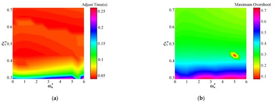 It can be seen from Figure 3b that with the value of pole damping coefficient increasing gradually, the overshoot of the system decreases gradually. When the value range of is between 0.4 and 0.7, the overshoot of the system is small and the dynamic performance of the system tends to be stable. When the value range of is between 0.3 and 0.4, the system overshoot is large and the system instability is high. The value of natural frequency has little influence on the overshoot of the system, but when the value of is about 5 and the value of is about 0.4, the overshoot of the system reaches the minimum and the system is stable.