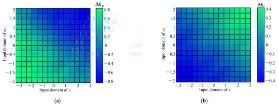 When designing the fuzzy PI controller, double input and double output mode is adopted. The double input variables of the fuzzy rule are the error e and the error change rate ec of the double flexible system. The Gaussian function is selected as the membership function of the double input variables. The double output variables of the fuzzy rule are and , and the triangular function is selected as the membership degree of the double output variables. The input variable domain of fuzzy PI controller is set to [−3,3], and the output variable domain is also set to [−3,3]. Set the input error domain to [−1,1], error change rate domain to [−2,2], and actual output controller domain to [−0.5, 0.5]. However, in the design of fuzzy controller, it is impossible to distinguish these four parameters directly. Therefore, these four parameters should be fuzzy, as shown in Equation (36).