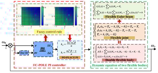 Finally, using and , the parameters of the improved PI controller are adjusted adaptively, and the precise results of the output variables are obtained by defuzzification. To sum up, the improved fuzzy PI control block diagram of the double flexible body system is shown in Figure 5 below.