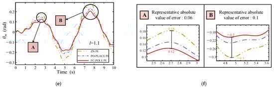 According to Figure 6b, Figure 7b and Figure 8b, Figure 6d, Figure 7d, Figure 8d, Figure 6f, Figure 7f and Figure 8f, representative absolute values of errors can be observed. As the length of the flexible beam increases, the fluctuation of rotation frequency, output torque and output angle of the double-flexible system will increase. After using the pole assignment method to set PI control parameters of the system, the fluctuations of rotation frequency, output torque and output angle of the system will decrease by about 10%. After using the improved fuzzy PI control strategy proposed in this paper, the system rotation frequency, output torque and output angle fluctuations will be reduced by about 20%. By analyzing the absolute value of the error, the effectiveness of the proposed improved fuzzy PI control strategy on vibration suppression of the dual-flexible system can be further verified.