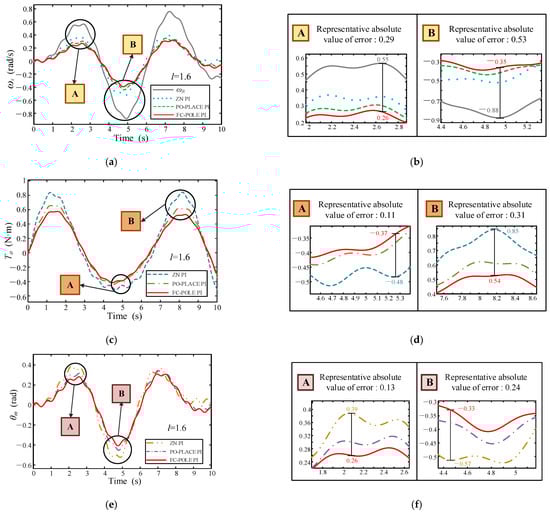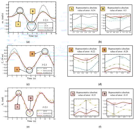 According to the parameters of three kinds of dual-flexible systems in Table 2, the influence of the control strategies of ZN method, pole assignment PI method with the same damping coefficient and improved fuzzy PI method on the output rotation frequency and torque changes of the dual-flexible system is obtained in the case of flexible Euler beams with different lengths of flexible joints. The numerical simulation results obtained are shown in Figure 6, Figure 7 and Figure 8 below. In Figure 6a, Figure 7a, Figure 8a, Figure 6c, Figure 7c, Figure 8c, Figure 6e, Figure 7e and Figure 8e, respectively, represent the fluctuation trend of system rotation frequency, torque and angle. Figure 6b, Figure 7b and Figure 8b are the local enlarged image of the marked part in Figure 6a, Figure 7a and Figure 8a. Figure 6d, Figure 7d and Figure 8d are the local enlarged image of the marked part in Figure 6c, Figure 7c and Figure 8c. Figure 6f, Figure 7f and Figure 8f are the local enlarged image of the marked part in Figure 6e, Figure 7e and Figure 8e.