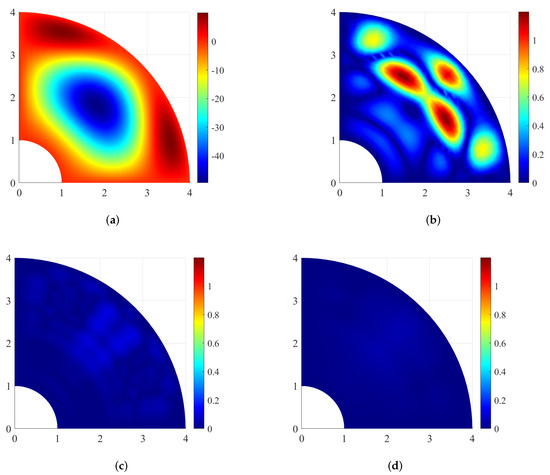 The diagram of v.s. is illustrated in Figure 5. The RMSE error has the smallest value, but the overall trend is the same for all three errors. The error decreases rapidly after the first knot refinement and slows down the rate of increase after the second knot refinement because the number of control points gradually approaches the number of collocation points. The analytical solution to the problem (29) is plotted in Figure 6a. Furthermore, the absolute error distributions after three round iterations are shown in Figure 6b–d. The maximal absolute error is decreased from 0.032 to when the number of control coefficients arises from to .