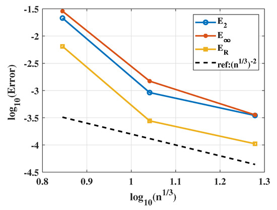 and is a quarter of an annulus domain. The analytical solution for this problem is . We initially select initial control points and Greville collocation points. The maximum number of iterations per round is set to 5000. In 2D and 3D, we use the square of the 2-norm error between the steps of iteration as the convergence error. Moreover, we reduce the error tolerance by 0.1 after each round of iteration. As a result, each round iteration is sufficient. The diagram of vs. is illustrated in Figure 3. The figure shows that the IG-LSPIA algorithm has consistent convergence under the three errors , , and .