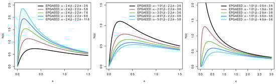 The EPAIG-E distribution (EPAIG-ED) is defined from Equations (8) and (9) by taking , , and to be the pdf, cdf, HRF, and CHRF of the ED with the positive parameter