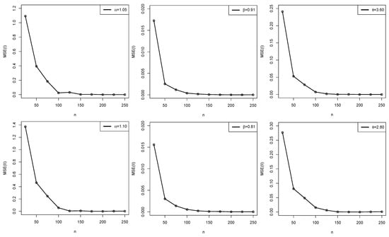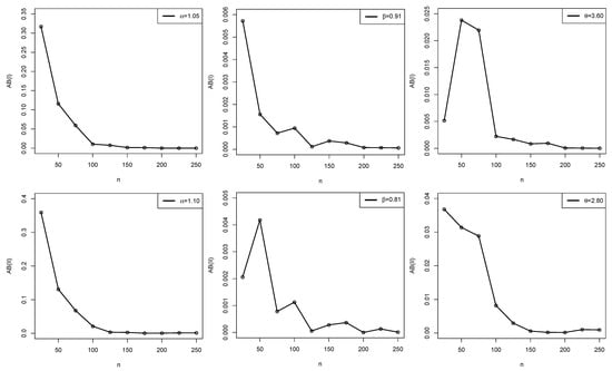 For the Monte Carlo (MC) simulation of the EPAIG-ED, from Equation (82) we consider that p is a uniform r.v. in (0,1). We simulate EPAIG-ED (for Set I: and for Set II: ) for times. For every sample size, we compute MLE for , , and . We consider 1000 MC replicates of this process and compute the average estimates (AEs), biases, absolute biases (ABs), and mean squares errors (MSEs). The results in Table 1 and displayed graphically in Figure 4 and Figure 5.