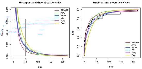 Histogram and estimated pdfs (left); empirical and estimated cdfs (right) of the EPAIG-E, APE, EAPE, EE, KwE, and Exp. models for the runoff data.