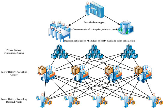 Three research objects (i.e., single disassembly center, multiple recycling centers, and multiple customer demand points) are involved in this study. Owing to the business scope of an enterprise and the distribution of resource dominance power, the model includes service scope constraints, demand point capacity constraints, and economic capacity constraints. In the process of business operation, transportation cost constraints, time cost constraints, and vehicle loading constraints are also considered. In line with satisfaction functions, this study forms a facility positioning-transportation path problem in the power battery reverse supply chain logistics. When there is a need to respond to demand, certain recycling centers around the point of demand should be selected to facilitate more efficient operation of the reverse supply chain. The recyclable power battery is accurately recovered by each customer demand point, and transported back to the designated location through the unified scheduling of vehicles in the recycling center. The material is recycled and the power battery is remanufactured according to the recycling demand and disassembly demand of the location. The established bi-level programming model determines the location of the recycling center and the transportation route to each demand point on the basis of the specific coordinates of the demand point, so as to realize the rapid response and effective recycling of the power battery reverse supply chain system, as shown in Figure 1.