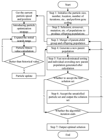 Step 6: To make the distribution of the set of solutions more balanced in the solution space, the crowding degree operation is carried out. Firstly, the individuals of each level are arranged according to the objective function value, and the standard deviation and minimum value are marked. The operation is carried out according to the crowding degree formula to obtain the final objective function value. When the bad solution is less than or equal to the current solution, the current solution is received. When the bad solution is equal to the current solution, all the bad solutions are received at the probability. The receiver rate of the bad solution is: . With , the particle motion energy is weakened, and the probability of being subjected to a bad solution is gradually reduced. Finally, all bad solutions are not received and are expressed as the ratio of the bad solution to the current solution. Then, the comparison between the receiving probability and the random probability is used to determine the choice of the bad solution. When the receiving probability is equal to the random generation probability, accept. Populations read the bad solution and then regenerate new populations. Finally, perform particle decoding and turn to Step 4. Otherwise, refuse, and turn to Step 7.