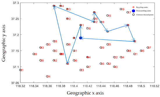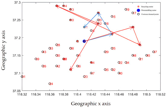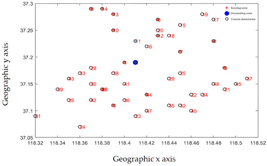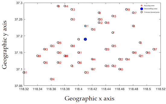 The initial diagram of customer demand point and recycling center location is shown in Figure 11. Each customer requirement point is evenly distributed around the disassembly center. The demand of each requirement point varies according to market changes and the scope of business operations. The distribution of demand points in Figure 11 is more in line with the law of market development. The recycling center location results are shown in Figure 12.