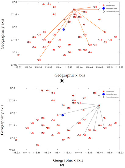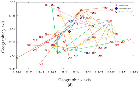 Recycling centers are responsible for the customer demand points and the overall layout, as shown in Figure 13a–d, where Figure 13a–c represent the situation where the customer demand points are from less to more, and the responsible area is determined by the construction and operation of the recycling center in the area, including the affordable transportation freight volume, schedulable vehicles, and callable personnel. From Figure 13d, it can be seen that each recycling center is generally responsible for customer demand points. The areas responsible for power battery recycling in each recycling center are different, and the coverage is not coincident, which is generally conducive to enterprise vehicle scheduling and power battery recycling.