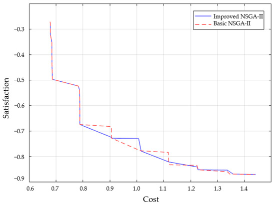 After running the basic and improved NSGA-II optimization algorithm 10 times, average values of each algorithm and their optimization comparisons are shown in Table 6. The total cost of the improved algorithm is calculated to be $143,911.0049, whereas that of the basic algorithm is $144,623.1240. The customer satisfaction is improved by 0.0817, and the calculation time is reduced by 0.631 s. Therefore, the power battery reverse supply chain scheduling optimization model and the improved algorithm proposed in this paper is effective and feasible.