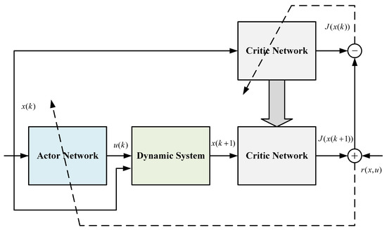In the early stage, ADP was mainly used in the fields of computer science and operational research [14] and then gradually integrated with RL technology to solve optimal control problems later. Theoretically, ADP borrows from the basic principle of RL. That is, an agent interacts with the environment and constantly adjusts its strategy to achieve the optimal cumulative feedback (return) to solve an optimal decision problem. In 1977, Werbos proposed four basic ADP structures [11,15]: Heuristic Dynamic Programming (HDP), Dual Heuristic Programming (DHP), Action Dependent HDP (ADHDP), and Action Dependent DHP (ADDHP). Generally speaking, these ADP structures mainly include an actor-critic framework with the use of neural network approximation structure, which significantly improves the online learning and adaptive abilities of ADP. The basic structure of ADP is given in Figure 1. The ADP method not only avoids the “dimensional disaster” problem in dynamic programming (DP) methods, but also provides an effective way to solve the decision control problem of complex nonlinear systems, which makes it become an important research direction in the fields of artificial intelligence and control theory [9,16].