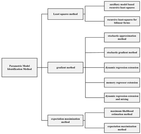 A parametric model identification method needs to determine the model structure and order of the system in advance, and then estimates the unknown parameters of the system model. This method mainly includes the least squares method, the gradient method, the maximum likelihood estimation method, and expectation maximization method. The overview of the parametric model identification methods is illustrated in Figure 2.