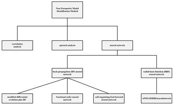 The model reconstructed by the non-parametric model identification method is called a non-parametric model. It does not mean that there are no parameters in the model but that it does not need to determine the structure and order of the model in advance, which is the advantage of the non-parametric model identification method. Non-parametric model identification methods include some classic identification methods, such as correlation analysis and spectral analysis, etc. It also includes neural network (NN) models which have been developed rapidly in recent years. A neural network has been widely used in nonlinear system control because of its high nonlinearity, approximation ability, and strong self-learning ability. At present, non-parametric model identification methods mainly include: Back-Propagation (BP) neural network non-parametric model identification and Radial Basis Function (RBF) neural network non-parametric model identification. The overview of the non-parametric model identification methods is illustrated in Figure 3.
