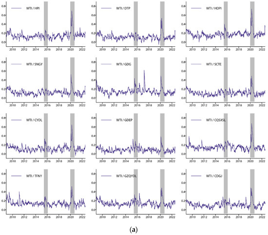 Next, we proceed to explore the impact of extreme events on volatility spillover. The results of Panel B and Panel C in Table 3 report the volatility spillover during two sub-periods. As is shown in the results, the total volatility spillover index increased to 74.43% and 74.49%, respectively during the sub-periods covering the Chinese stock market crash and COVID-19 outbreak, indicating that the spillover effects increased sharply under the impact of the crisis. The net volatility spillover indexes of WTI remain negative, with values of −18.40% and −22.76%, respectively. The same is true for gold, which is −4.61% and −21.26%. It means that WTI and gold are still net recipients of systemic shocks during the two crisis periods. It is worth noting that there are differences in the impact of the two crises, which can be explained by the finding of Choi [76] that the fundamental causes of the crises are diverse. Concretely, the 2015 Chinese stock market crash was caused by internal financial problems in China and had a limited impact on the world economy in a short period. In contrast, although the Chinese economy was the earliest to be affected by COVID-19, it quickly spread globally and sent strong shock waves throughout the world’s economy. Therefore, during the market crash, the impact of WTI on electricity companies has not changed significantly, while these electricity companies increase the intensity of volatility spillover transmitted to WTI. However, both parties’ contributions to the variance of volatility error have increased profoundly during the period of COVID-19. These results are suggestive of the fact that the increase of volatility spillover is bidirectional between the electricity stock market in China and WTI during the COVID-19 pandemic crisis, thus we can infer that the pandemic has an important impact on both WTI and China’s electricity stock market. In contrast, during the market crash period, the increase in volatility spillover is unidirectional from China’s stock market to oil, indicating that electricity companies’ stock has been directly impacted by the stock market collapse, and then spread to WTI. Furthermore, the volatility spillover effects between gold and electricity companies’ stocks are also deeply influenced by the pandemic. However, it is worth noting that during the stock market crash period, the spillover effects from electricity companies to gold did not increase dramatically, demonstrating that the collapse of China’s stock market did not have a tremendous impact on gold.