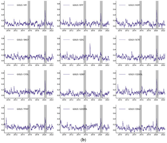 (a) Dynamic conditional correlation between WTI volatility and electricity companies’ stock price volatility; (b) Dynamic conditional correlation between gold volatility and electricity companies’ stock price volatility. Note: The first and second shaded bars refer to two crisis periods, namely, the stock market crash period and the COVID-19 epidemic period.