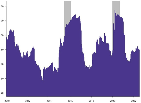 Since the static analysis only provides the average spillover effects, we examine the spillover index over time to better understand the dynamic features of the total volatility spillover, which are shown in Figure 2. It is important to point out that the time-varying total volatility spillover over the whole sample is calculated based on 200 days of rolling windows, and the forecast horizon is selected to be 30 days. Several dramatic changes can be found from it: Firstly, the most fascinating point is that two significant peaks exceed 70%, which coincide with the two crises depicted as shadow areas. More specifically, the total volatility spillover has been rising continuously since 2015, which may be caused by the oil price crash. After that, the spillover index experienced a slight decline, but it rose sharply due to the collapse of China’s stock market in mid-2015 and exceeded 70%, which is the first shadow area. Notably, it did not fade out immediately as the stock market became gradually stabilized in mid-2016 but rather continued to rise until the beginning of 2017. These findings are consistent with those of Antonakakis et al.’s [24] argument that some crises have a lasting impact on the total volatility spillover effect. Then, the total spillover trend continued with a steep nosedive until the end of 2017, whereas it rose sharply by more than 20% after a short period of stabilization, mainly as a result of the US-China trade war in 2018. Soon afterward the percentage of total spillover showed a downward trend, but increased sharply due to the outbreak of COVID-19, which is consistent with the second shaded area in Figure 2. As can be seen, the highest peak is found to exceed 75% during 2020–2021. Last but not least, unlike the stock market crash crisis, the total volatility spillover index rose suddenly when COVID-19 broke out, reached its peak rapidly, and then generally showed a downward trend rather than continuing to rise with the spread of the crisis.